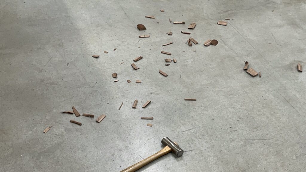 簡単に外せるパーツはそのまま外して交換しますが、今回の依頼品は、接着部分に問題はないものの、節穴から割れが生じていたため、ノミでの切削作業が必要でした。職人さんは手際よく、パーツを取り外していきます。