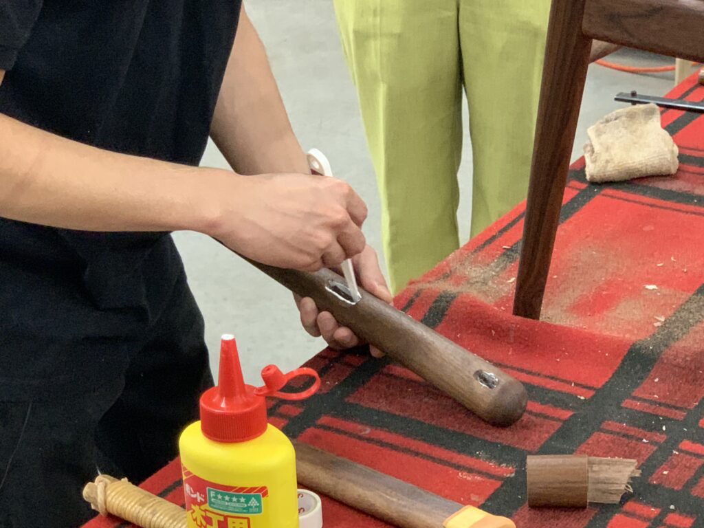 そして、新しいパーツの接合部に接着剤を塗布し、ゴムハンマーで打ち込みます。必要に応じて同じ作業を2~3回と繰り返しながら、丁寧に組み立てていきます。