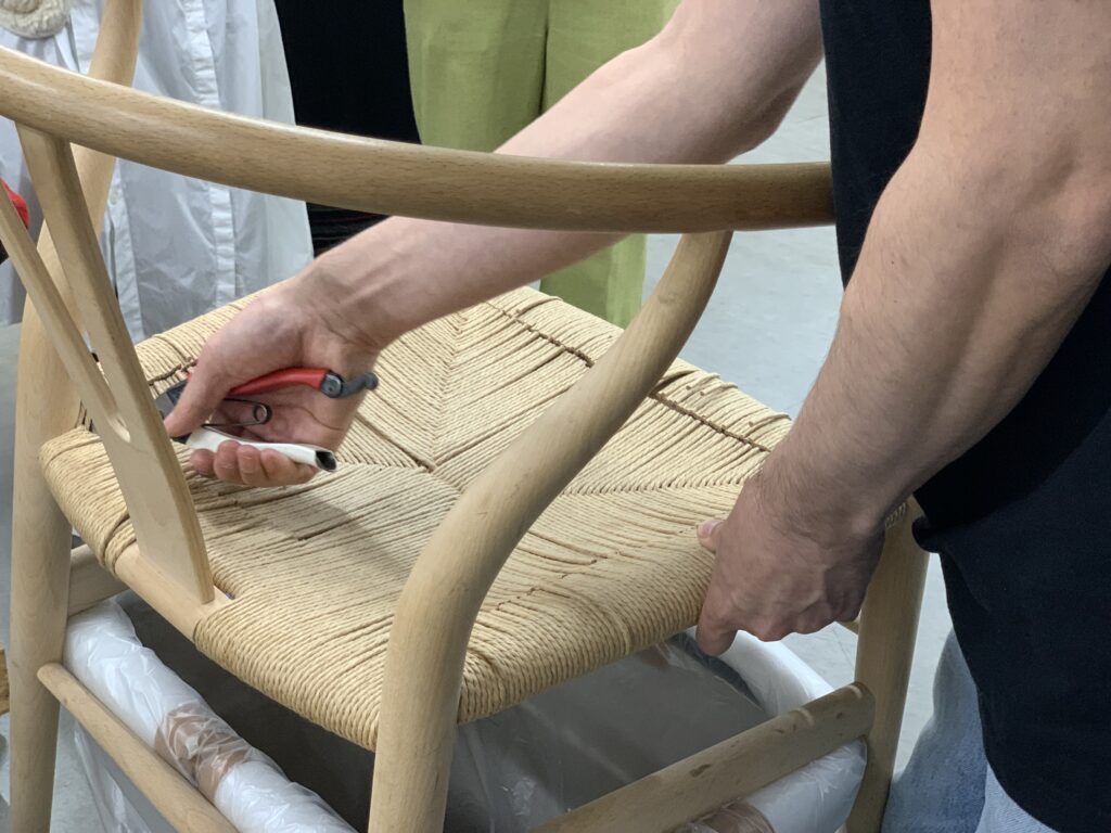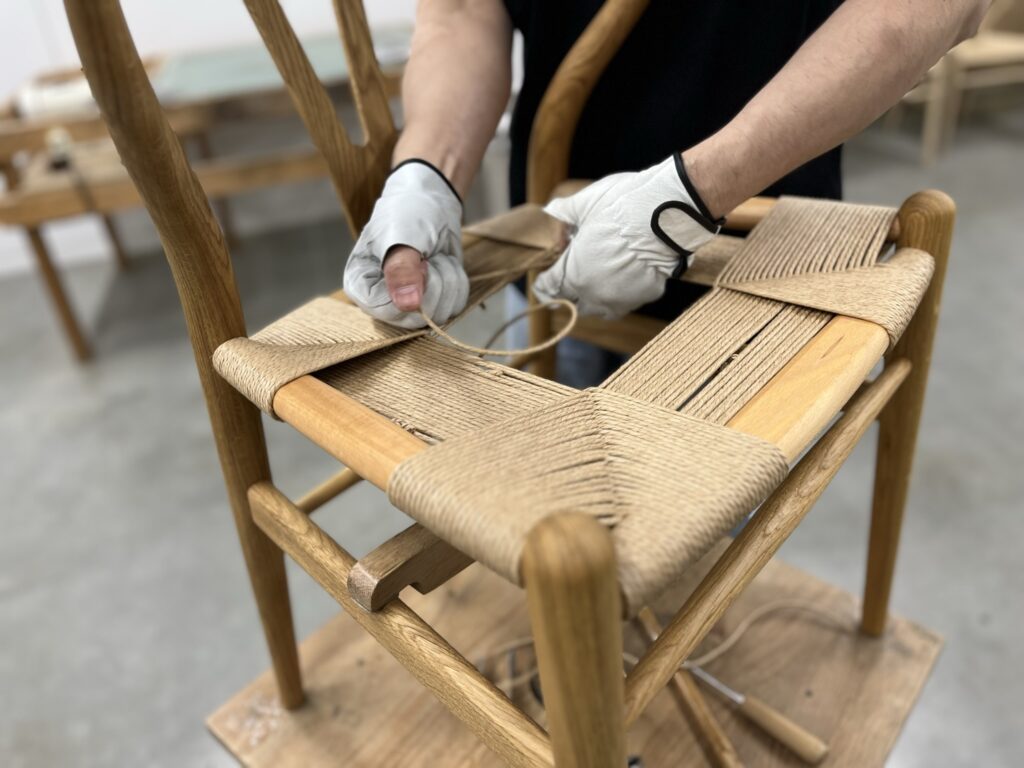 ここから、いよいよペーパーコードの張り替え作業に入ります。作業台に固定したYチェアを中心に、時計回りでまわりながら、約1時間、休憩を挟まずに編み続けます。どれだけ密に編めるかで耐久性が大きく変わるため、斜めの角度を意識しながら、網目がつまるまで、力を込めて編み込んでいきます。そのため、どんなに熟練した職人さんであっても1日に張り替えられるのは数脚が限界とのこと。
