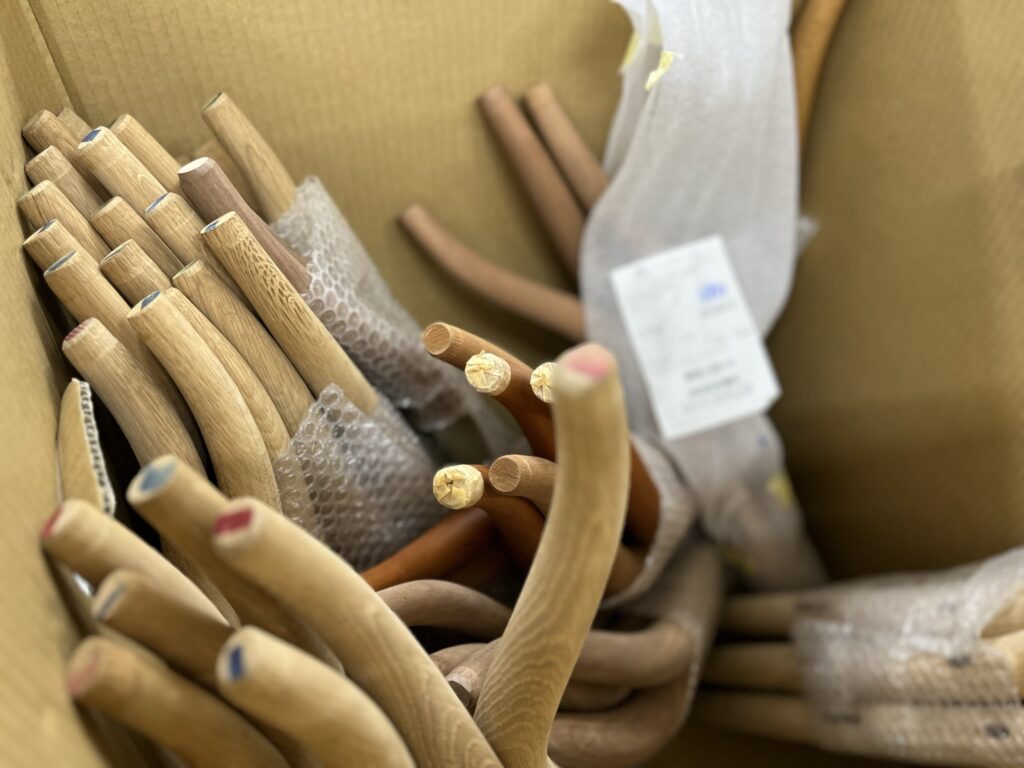 樹種や仕上げ、前脚・後脚・アームなど、さまざまな修理依頼に対応できるよう、多くのパーツが常に用意されています。